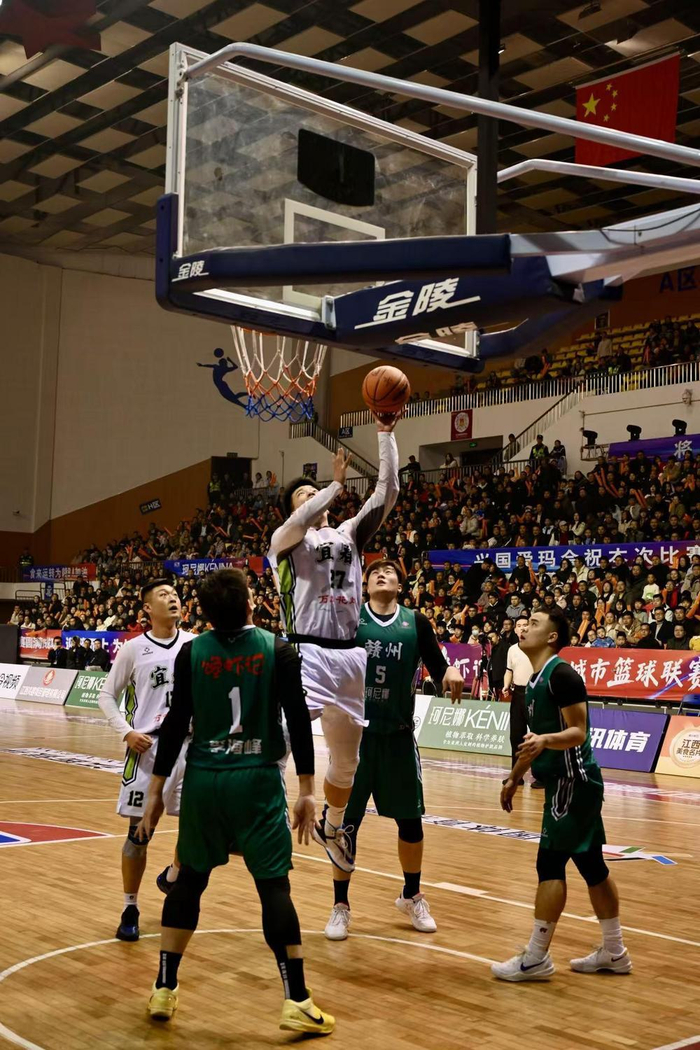 在与赣州队的对战中,宜春队球员面对防守从容不惧,强硬上篮。